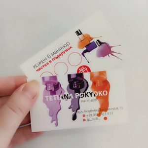 - І останній популярний спосіб виготовлення візиток – шовкографія. Такий спосіб підходить для виготовлення представницьких карток невеликими партіями. Друк такого типу здійснюється практично на будь-якому матеріалі: папір, тканина, пластик, скло, тощо, що і є головною перевагою цього способу. Недолік – висока ціна і обмеження при виборі макету. Можливо виготовити від 50-100 штук.